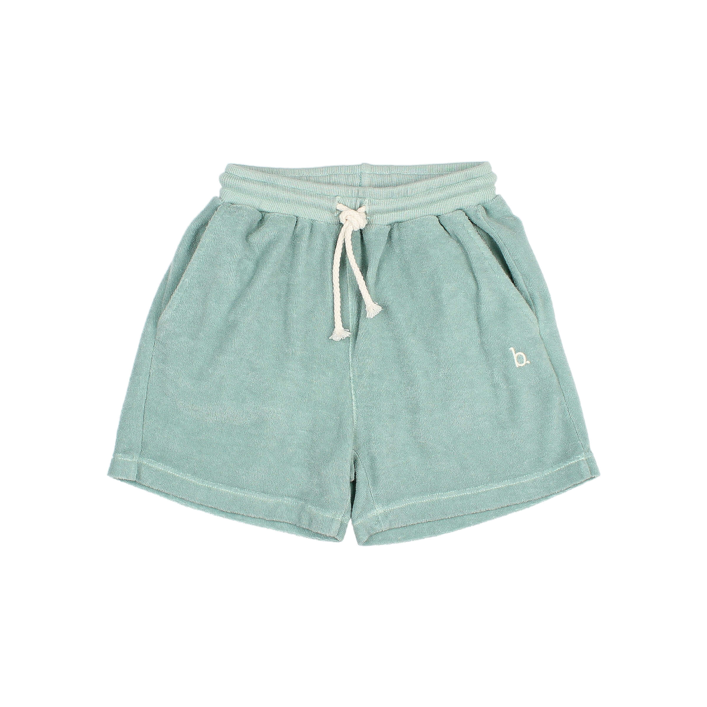 Terry cloth bermuda. Elastic ribbed waistband with raw cotton drawstring for a better fit. Front pockets. Plastron-style pocket on the back. Contrasting embroidered detail.